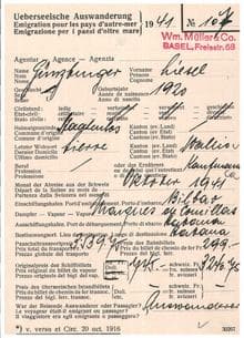 Auswanderungsdokument aus der Schweiz 1941 von Lisbet Günzburger (Quelle: Ancestry).