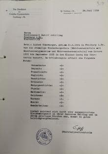 Abschrift des Abgangszeugnisses von Lisbet Günzburger nach der neunten Klasse an der Hindenburgschule in Freiburg (Quelle: StaF F 196/1 Nr. 11904).