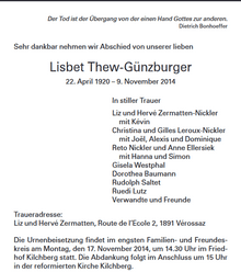 Traueranzeige von Lisbet Thew-Günzburger, die 2014 in der Schweiz verstorben ist (Quelle: Privatarchiv Familie Nickler Leroux).