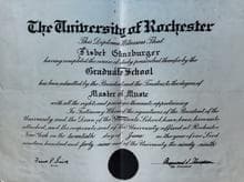 „Erst nach unserer Ankunft in den Staaten (17. Juni 1942) konnte ich wieder an mein so lang erwünschtes akademisches Studium denken, weil dort eine Matura im europäischen Sinn nicht erforderlich ist. Ich rückte meinem Ziel, Musikwissenschaft zu studieren um ein Beträchtliches näher, als ich im Herbst 1942 an der 'Eastman School of Music of the University of Rocherster' in Rochester, N.Y. aufgenommen wurde. Dort erlangte ich 1945 (in drei statt in vier Jahren und mit Auszeichnung) meinen ersten akademischen Grad 'Bachelor of Music'. Dieser Grad wird durchschnittlich mit 21 Jahren erworben. Da ich aber erst mit 22 Jahren mein Studium beginnen konnte, war ich trotz hart konzentrierter, beschleunigter Arbeit 25 Jahre alt, als ich ihn erhielt. Erst nach Erlangung dieses Grades, welches der Erwerbung breiter musikhistorischer und musiktheoretischer Grundlagen sowie der Ausbildung im Orgelspiel diente, konnte ich mich dem musikwissenschaftlichen Studium zuwenden. Diesen Teil des Studiums verdiente ich mir zum größten Teil selbst, als Assistentin eines meiner Professoren, durch Sprachunterricht, durch Arbeit an der Musikbibliothek und als Organistin. Im Frühjahr 1949 erhielt ich dann meinen zweiten akademischen Grad ‚Master of Music‘, was ungefähr einem Lizensiat entspricht. Ich war damals 29 Jahre alt. Hätte ich von Anfang an meine Studien einigermassen normal verfolgen können, so hätte ich schon in diesem Alter mein Doktor-Examen (was eigentlich zu diesem Studium gehört) hinter mich gebracht. So aber musste ich mich mit einem ‚Master’s Degree‘ begnügen. Dies ist natürlich ein bedeutender Schaden und ein bleibender Schaden, der mir aus der durch die Rasseverfolgung bedingten Studienverzögerung erwachsen ist.“