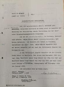 Eidesstattliche Versicherung von Inge Kutchins vom 29. Februar 1958. Tatsächlich wurde sie nicht 1936, sondern 1938 eingeschult (Quelle: StaF F 196/1 Nr. 11640).